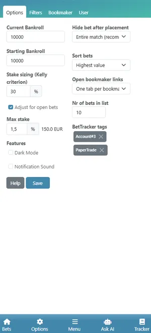 In the Options view you can customize your betting strategy and risk level, like Kelly stake sizing and max stake. You can also adjust general app functionality to better match how you place and manage your bets.