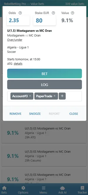 When you click on a value bet you will see the bet details panel. Here you can edit the odds and stake if you have to. In this view, you will get all the information you need to place the bet. You also have the option to bet, log, snooze or remove the bet. You don't have to calculate the value bet, it is done for you.